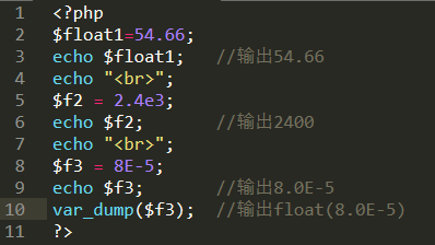 <?php $float1=54.66; echo $float1; //输出54.66 echo "<br>"; $f2 = 2.4e3; echo $f2; //输出2400 echo "<br>"; $f3 = 8E-5; echo $f3; //输出8.0E-5 var_dump($f3); //输出float(8.0E-5) ?>