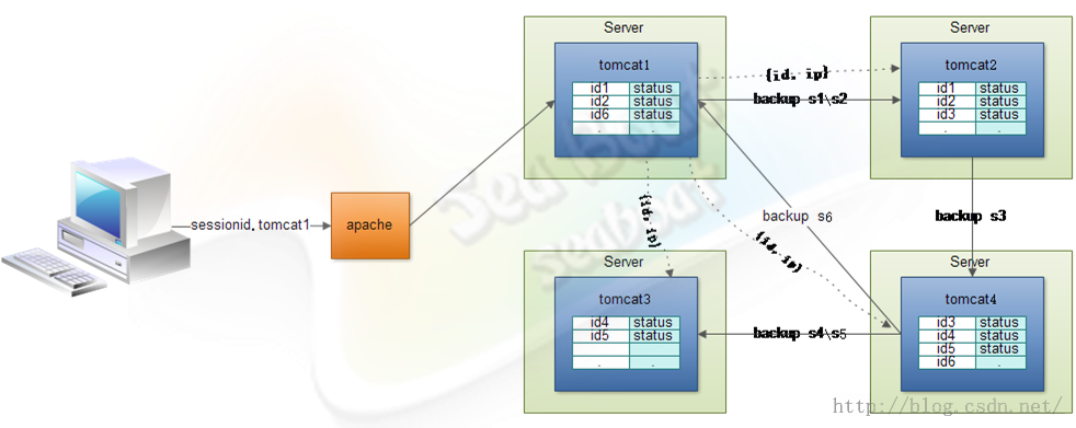 完成上面一步后就是将会话内容备份到备份节点上,假如tomcat1的s1、s2两个会话的备份地址为tomcat2,则把会话对象备份到tomcat2中,类似的有tomcat2把s3会话备份到tomcat4,tomcat4把s4、s5两个对话备份到tomcat3,这样集群中所有的会话都已经有了一份备份。当tomcat1一直不出故障,由于Session Stick技术客户端将一直访问到tomcat1节点上,保证一直能获取到会话。而当tomcat1出故障了,这时tomcat也提供了一个failover机制,apache感知到后端集群tomcat1节点被移除了,这时它会把请求随机分配到其他任意节点上,接下去会有两种情况: