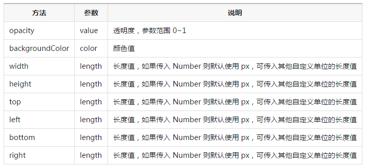 动画实例可以调用以下方法来描述动画,调用结束后会返回自身,支持链式调用的写法。