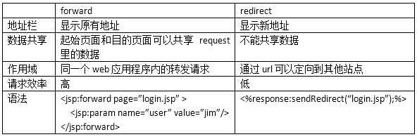 forward是服务器内部重定向,程序收到请求后重新定向到另一个程序,客户端无需知道;redirect则是服务器收到请求后发生一个状态头给用户,用户再次请求,这样会有两次客户端到服务端的通信,由于是再次请求,因此上一个jsp的信息不被保留。