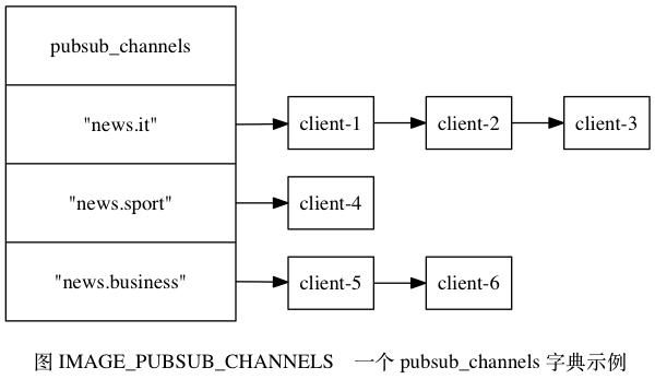 举个例子, 假设服务器 pubsub_channels 字典的当前状态如图 IMAGE_PUBSUB_CHANNELS 所示, 那么当客户端 client-10086 执行命令: