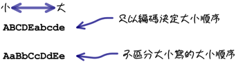 在决定大小顺序的时候,如果只有考虑字母大小写因素的话,那还不算是太复杂的。如果再考虑各种不同语言特性的话,在决定大小顺序的时候就会变得很复杂。以繁体中文来说,它是没有区分大小写的,而且一个中文字会包含一个以上的位元组,其它的语言也都会有类似的情况。