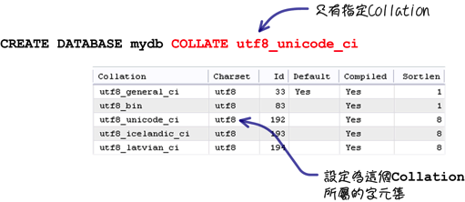 另外一种是只有使用「COLLATE」指定collation,MySQL会使用你指定collation所属的字元集: