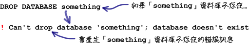 为了避免上列的错误,你可以在删除资料库的时候,加入「IF EXISTS」指令,如果你指定的资料库名称存在,同样会删除指定的资料库;如果不存在,MySQL只会产生警告讯息: