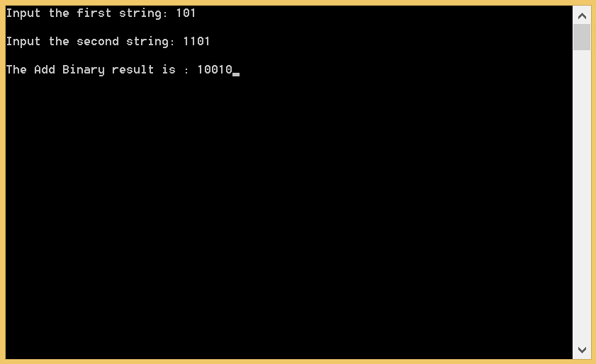 这道题考察两个二进制数相加,考虑到输入的是两组string,同时注意在运算时从左到右分别是从低位到高位,因此需要考虑对输入进行翻转处理,中间二进制树相加部分没有过多的设计障碍,主要是计算进位;在两组数据相加完成后,还需要考虑最高位的进位问题。