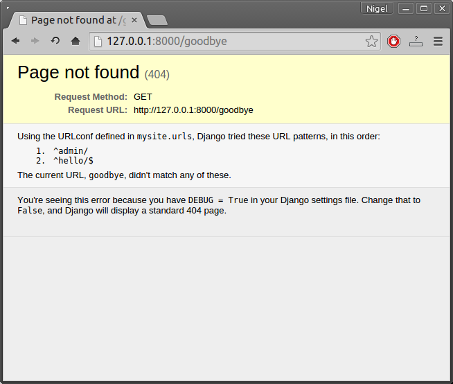 To find out, try running the Django development server and visiting a page such ashttp://127.0.0.1:8000/goodbye/ or http://127.0.0.1:8000/hello/subdirectory/, or even http://127.0.0.1:8000/(the site “root”). You should see a “Page not found” message (see Figure 2-2). Django displays this message because you requested a URL that’s not defined in your URLconf.