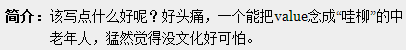 <p><strong>简介:</strong>该写点什么好呢?好头痛,一个能把value念成“哇柳”的中老年人,猛然觉得没文化好可怕。</p>