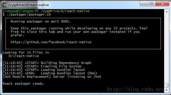 打开之前安装的cygwin终端,切换到当前react-native项目中。注意切换路径方法以实际项目路径为准