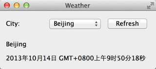 由于使用了 Qt5,我们选择新的连接语法。第一个connect()函数中,我们按照 API 文档中描述的那样对服务器返回的 JSON 字符串进行解析,然后将数据填充到一个WeatherInfo的对象。然后操作界面的两个控件显示数据。值得注意的是函数的最后一行,reply->deleteLater();。当网络请求结束时,delete 服务器返回的QNetworkReply对象是用户的责任。用户需要选择一个恰当的时机进行 delete 操作。但是,我们不能直接在finiahed()信号对应的槽函数中调用delete运算符。相反,我们需要使用deleteLater()函数,正如前面代码中显示的那样。第二个槽函数则相对简单,仅仅是重新获取新的数据。