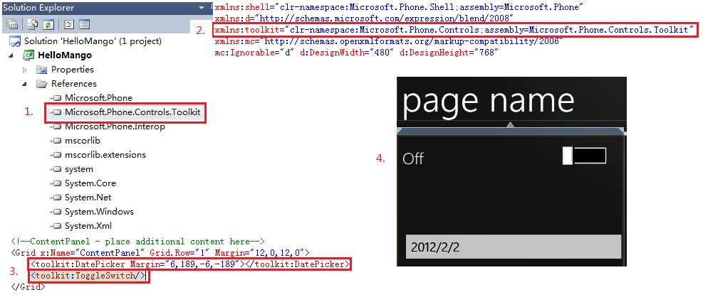 - 从解决方案浏览器里可以看到Microsoft.Phone.Controls.Toolkit程序集已经加入到了工程里(如图中1所示)。