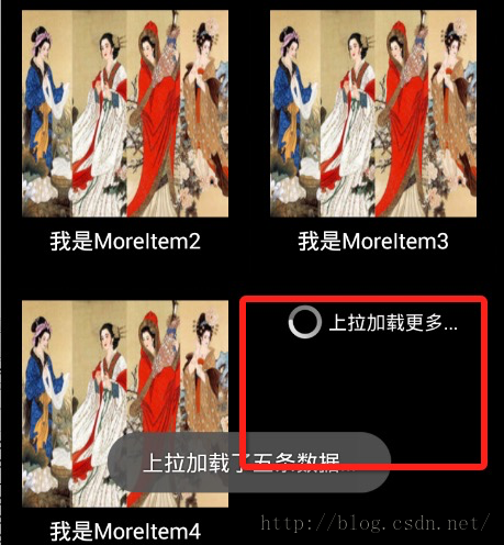 上面的代码中要使用SwipeRefreshLayout实现下拉刷新只要设置OnRefreshListener监听器即可,要实现上拉加载更多给RecyclerView添加OnScrollListener判断是否已经下拉滑动的底部,然后开始加载更多数据。