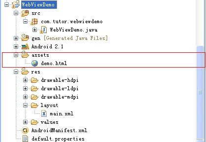 第一步:新建一个Android工程,命名为WebViewDemo(这里我在assets里定义了一个html页面)。