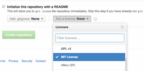 创建一个仓库时,Github会为你提供一个预置的软件许可列表: