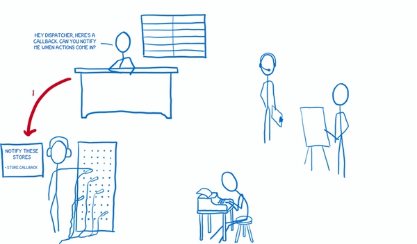 Store 告知 Dispatcher 只要有 action 产生就通知它。