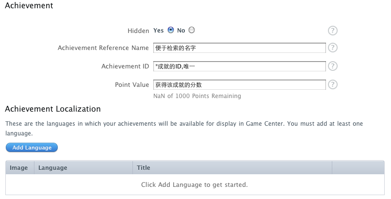 Achievements界面内容比较少,点击左上角的Add New Achievement,打开如下图所示的Achievements创建界面.