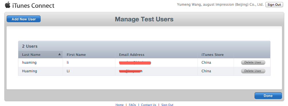 这里Himi已经创建了两个测试账号了,点击界面中的 “Add New User”进行创建即可;记住账号和密码哈,记不住就删掉重新建 娃哈哈~(切记:不能用于真正的AppStore中使用此账号,不仅不能用,而且一旦AppStore发现后果你懂得~)