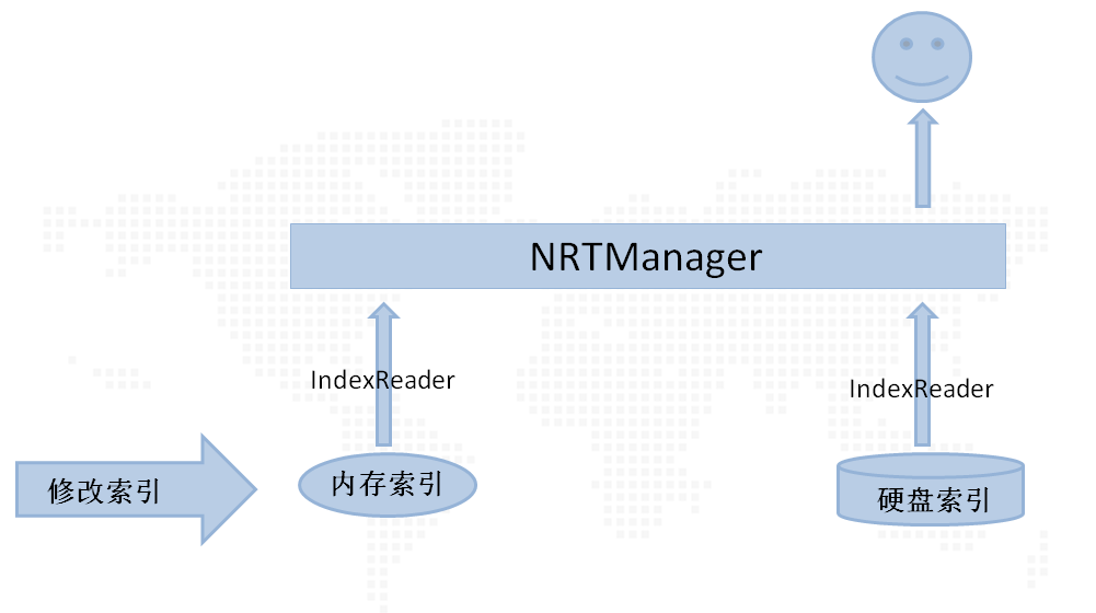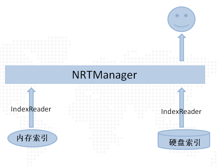 在前面的博客中也说过,程序初始话索引文件是十分消耗系统资源的,因此要想实现实时索引就不能实时的去修改索引文件、重新加载索引文件,就必须考虑如何使用内存来实现这实时索引;在Lucene4.3.1版本(之前的版本也有,但是在后面的版本中就将NRT相关的类删除了)中NRT相关类就提供了创建实时索引(伪实时索引)的相关方法,将IndexWrite的相关操作委托给TrackingIndexWriter来处理,实现了内存索引和硬盘索引的结合,通过NRTManager为外部提供可用的索引,当然,在执行commit(之前创建索引中有相关介绍)操作之前,操作的数据都是存在内存中,一旦宕机或者服务重,这些数据都将丢失,因此就需要自己添加一个守护线程去不断的执行commit操作(commit操作十分消耗系统资源,索引不可能每一次修改都去执行该操作)。下面就通过几个简单的图来介绍一下实时索引的实现原理: