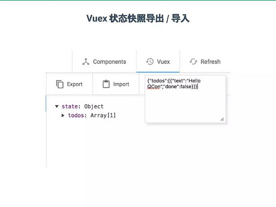 点击组件,就可以观察这个组件当前的状态。也可以把这个组件发送到控制台里。同时这个开发者工具还有一个 Vuex 面板,如果你用了 Vuex,那么每次操作都会被记录下来,记录下来的状态之间可以进行跳转。除此之外,还支持把当前应用的状态快照发送给另外一个人,这个人可以在他的控制台里导入你发送的状态,就可以立刻跳转到你之前所在的状态。这对于重现一些 bug,或要描述当前状态都很有帮助。