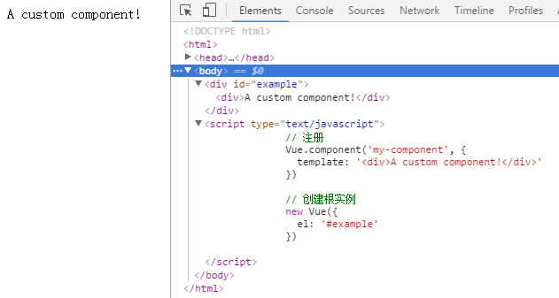 <div id="example"> <my-component></my-component> </div> <script type="text/javascript"> // 注册 Vue.component("my-component", { template: "<div>A custom component!</div>" }) // 创建根实例 new Vue({ el: "#example" }) </script>渲染为: