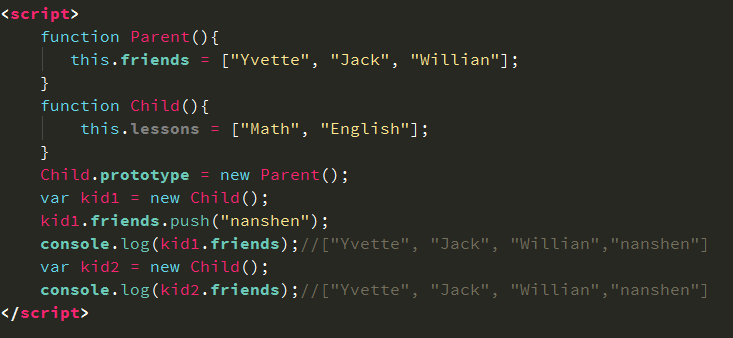 在Parent构造函数中定义了一个friends属性,该属性值是一个数组(引用类型值)。这样,Parent的每个实例都会各自包含自己的friends属性。当Child通过原型链继承了Parent之后,Child.prototype也用用了friends属性——这就好像friends属性是定义在Child.prototype一样。这样Child的所有实例都会共享这个friends属性,因此我们对kid1.friends做的修改,在kid2.friends中也会体现出来,显然,这不是我们想要的。