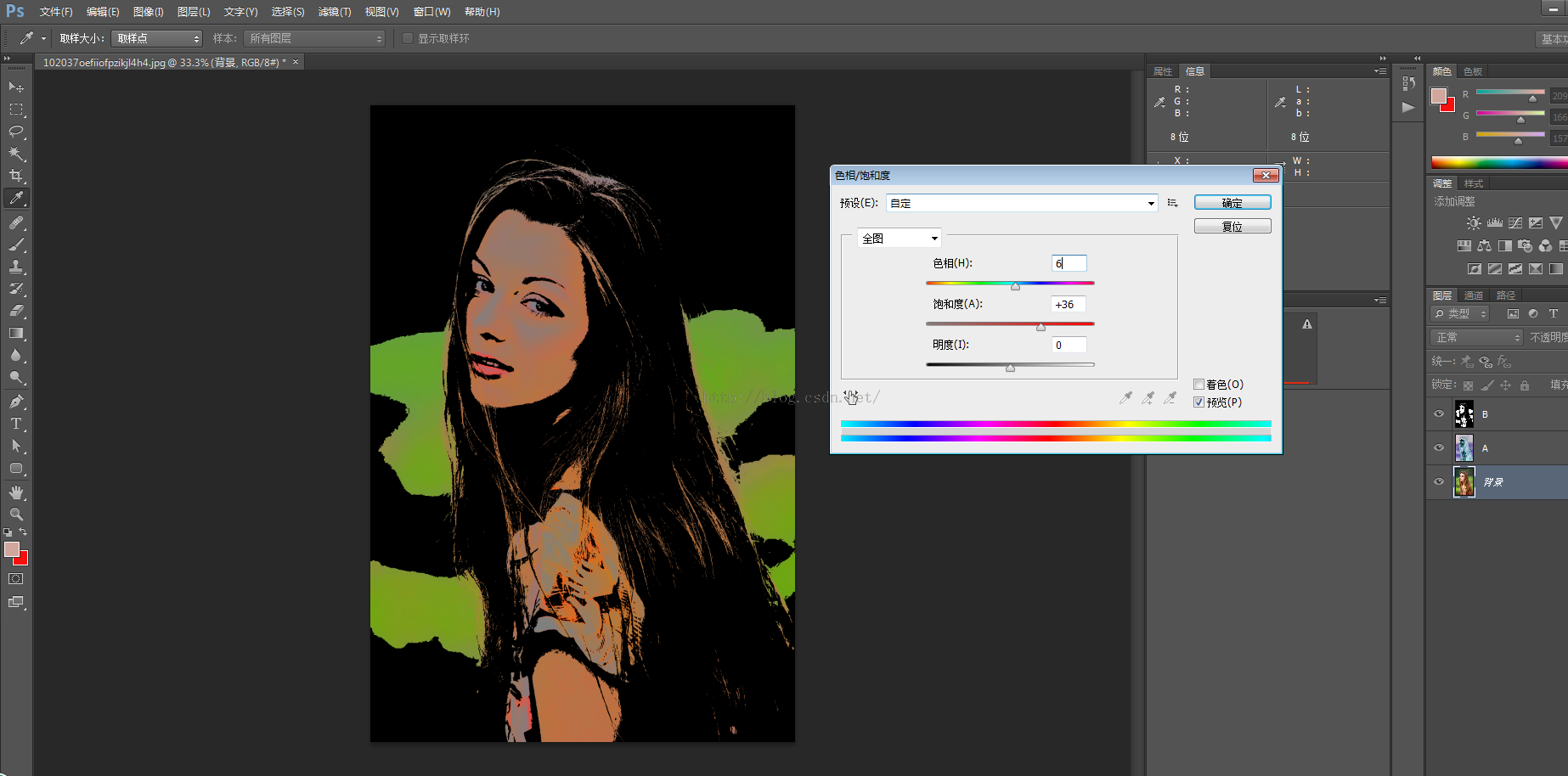 4,最后,对原始“背景”图层执行一定的饱和度调节: