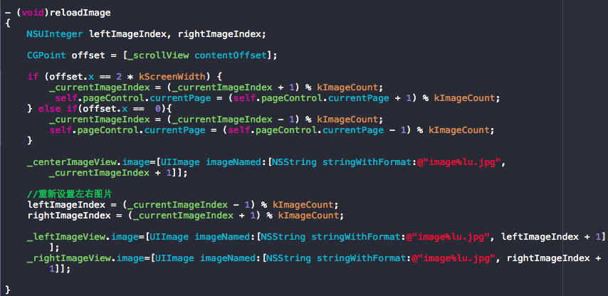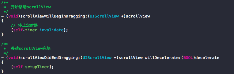 这里还需要注意的是,由于加入定时器有自动轮播的效果了,会与手动拖拽ScrollView冲突,即手动拖拽ScrollView过程时ScrollView可能自动移动更新图片了,显然这种效果是不符合用户习惯的,这时需要在ScrollView的代理事件中进行处理,即开始拖拽ScrollView时停止定时器,拖拽结束后再开启定时器。