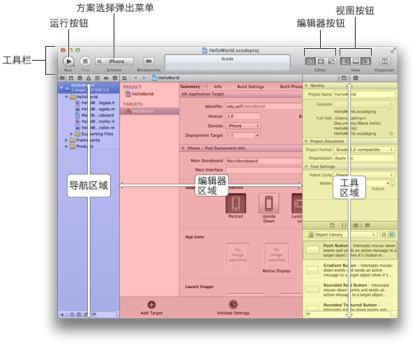 安装完Xcode,首先熟悉一下Xcode界面(这张是网上看到的一张图):