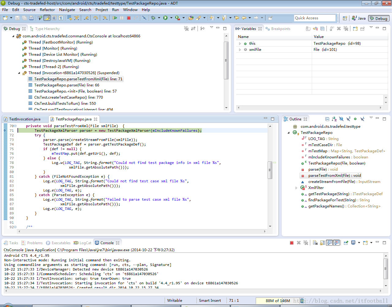 先创建一个TestPackageXmlParser对象,该对象继承于AbstractXmlParser,通过SAX的方式解析xml文件。有关SAX如何解析xml文件的内容我就不多阐述了。parser.parse(createStreamFromFile(xmlFile));按F5,调用的是TestPackageHandler类中的startElement方法。