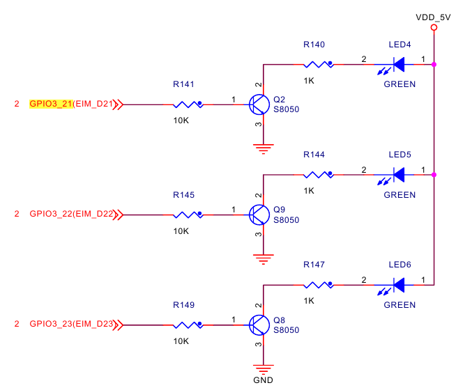 可以看到是GPIO3_21~23。而且是GPIO给高电平的时候接通。