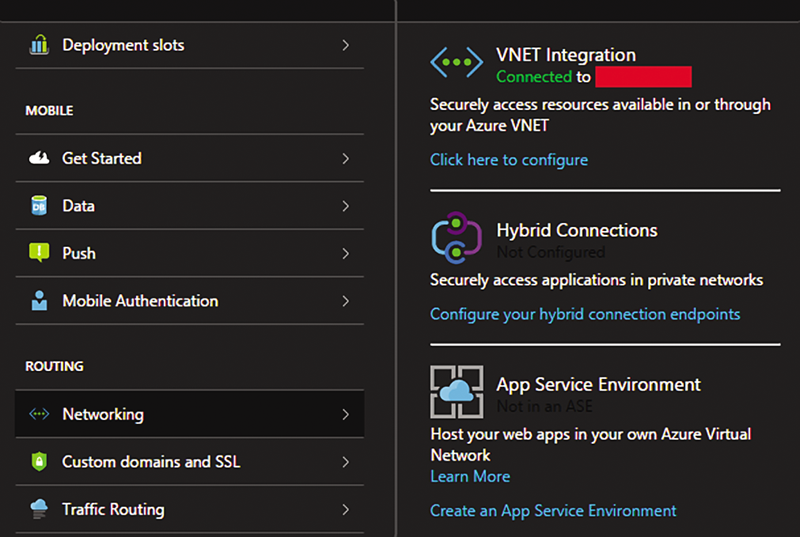若要承载我们在 Azure 中的解决方案,我们创建了一个 Web 应用程序。为获得最佳性能非常重要,我们部署 Web 应用程序到 Redis 实例所在的同一区域。一旦部署该应用程序后,我们创建 VNET 连接到我们 Redis 虚拟网络,允许服务以获取对数据的直接访问权限。此连接中进行了演示 图 3。