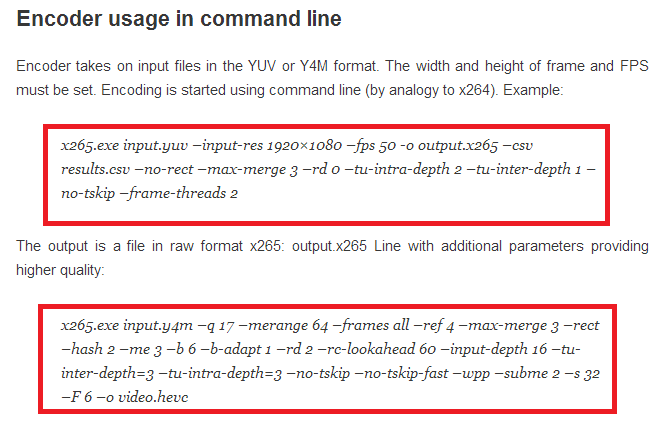 除了这两种经测试可以使用的方式外,网址:http://x265.ru/en/encode/还提供了两种略有区别的命令行方式,如下图所示: