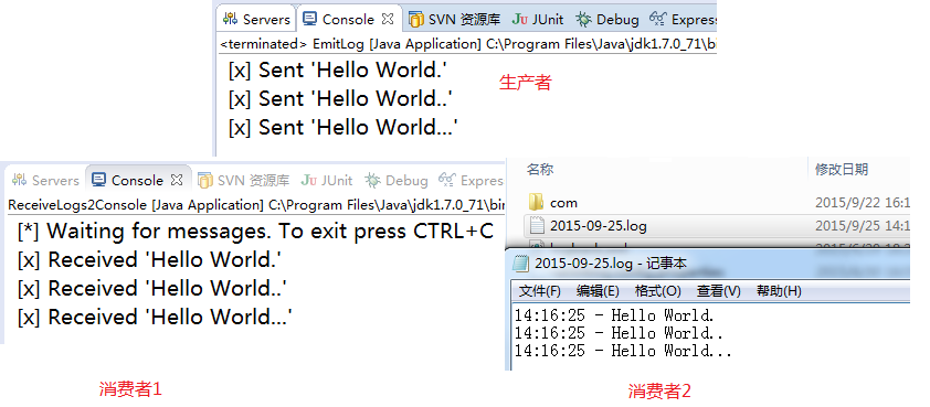 如果在日志系统中每一个接受者(订阅者)都会的得到消息的拷贝。那样的话,我们可以运行一个接受者(订阅者)程序,直接把日志记录到硬盘。同时运行另一个接受者(订阅者)程序,打印日志到屏幕上。