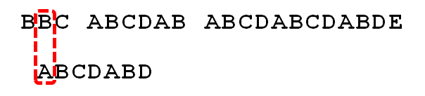 3. 结果第一个字符就不匹配,再看文本串中参加匹配的最末位字符的下一位字符,是"r",它出现在模式串中的倒数第3位,于是把模式串向右移动3位(r 到模式串末尾的距离 + 1 = 2 + 1 =3),使两个"r"对齐,如下: