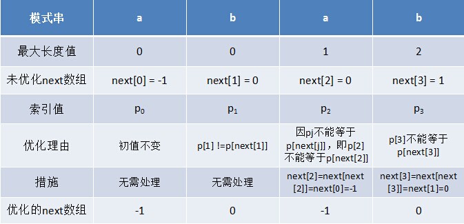 只要出现了p[next[j]] = p[j]的情况,则把next[j]的值再次递归。例如在求模式串“abab”的第2个a的next值时,如果是未优化的next值的话,第2个a对应的next值为0,相当于第2个a失配时,下一步匹配模式串会用p[0]处的a再次跟文本串匹配,必然失配。所以求第2个a的next值时,需要再次递归:next[2] = next[ next[2] ] = next[0] = -1(此后,根据优化后的新next值可知,第2个a失配时,执行“如果j = -1,或者当前字符匹配成功(即S[i] == P[j]),都令i++,j++,继续匹配下一个字符”),同理,第2个b对应的next值为0。