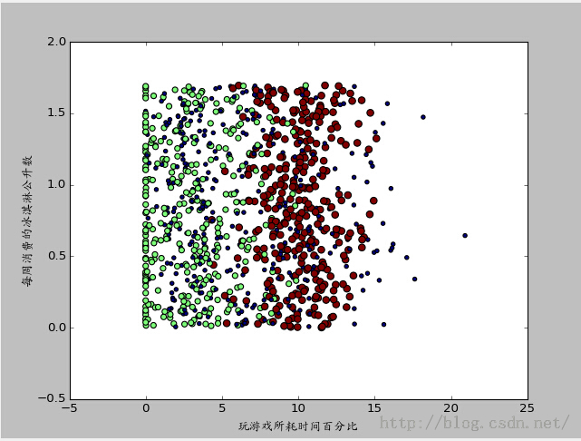 上图是没有样本标签的约会数据散点图,难以辨识图中的点究竟属于哪个样本分类,我们可以利用Matplotlib库提供的scatter函数来用彩色标记散点图上的点。重新输入上面的代码,调用scatter函数: