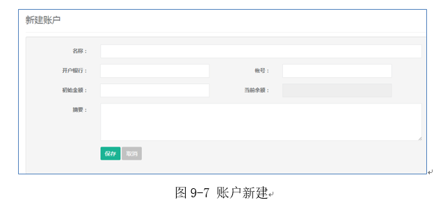 •账户新建:点击【新建】键,会出现如图9-7所示。填写名称、开户银行、账号、初始金额、当前余额、摘要,最后点击【保存】键确认即可。