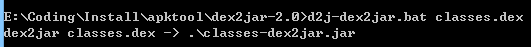 打开cmd,来到这个目录下:键入:d2j-dex2jar.bat classes.dex