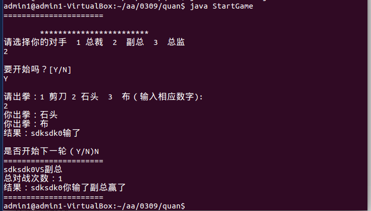 猜拳是由石头、剪刀、布组成,可以选择你的对手是谁,这里设定了3个对手(总裁、副总、总监),然后选择你的出拳,通过使用数字1、2、3来分别代表着3种状态。然后我们还需要加上计分的功能。这里我们建立4个类,人、机、主方法、测试类。