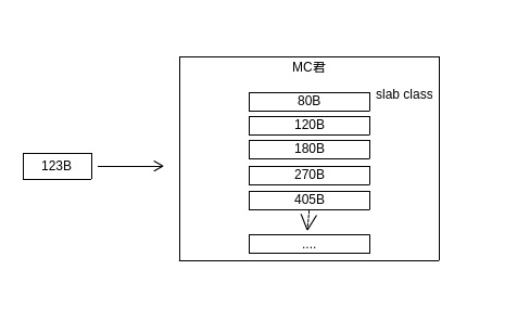 完成初始后,当某一个请求到来的时候——如图中所示由一个123B大小的元素希望找到存储空间,memcached会通过slab class表找到最合适的slab class:比元素大的最少的那个,在图中场景下为180B,即使所需的空间只要123B。