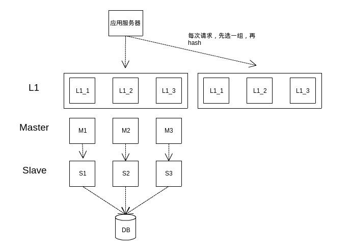 引入L1后,slave过冷并没有被解决,同时,由于master被放置到L1之下,也遇到了slave的问题,master的数据也存在过冷的风险。为了解决上面的问题,我们在线上配置的时候,会将整组slave做为L1的一组资源进行配置,让slave以L1的身份承担部分的热请求。同时为了解决master过冷的问题,我们也会让应用服务在选择L1的时候有一定的概率落空,从而让master作为L1逻辑分组,去承担部分热请求。整体结构图如图13所示: