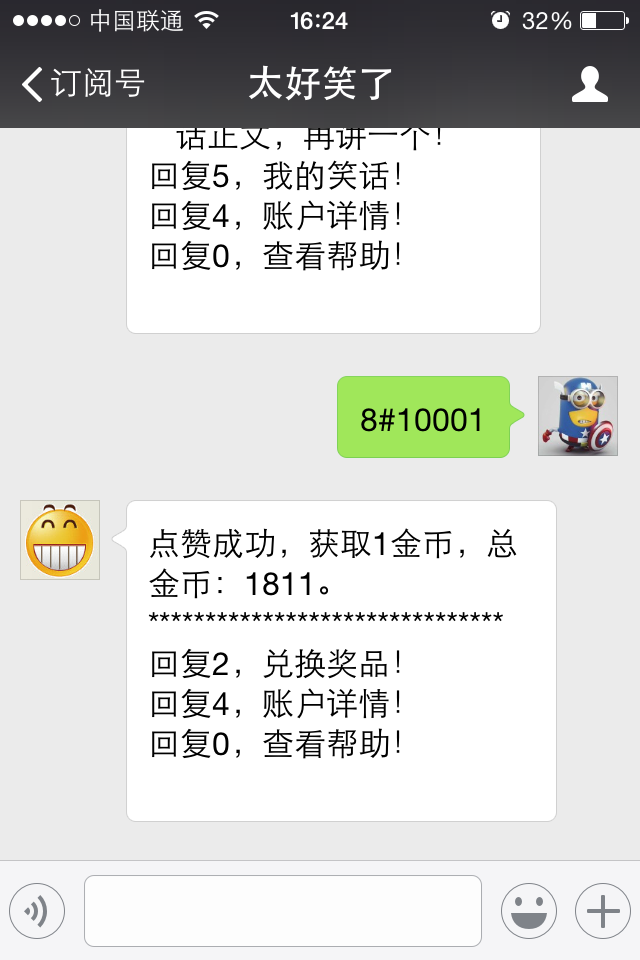 关注公众号后,会自动获取1000金币,然后默认将一个笑话。