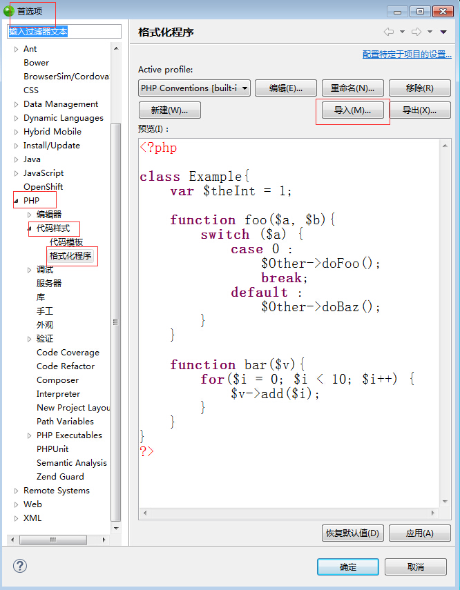 2)导入配置。窗口 > 首选项 > PHP > 代码样式 > 格式化程序 。