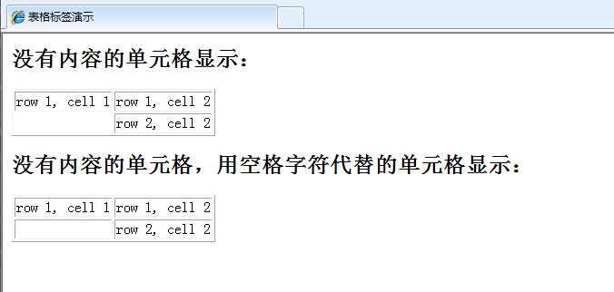 在一些浏览器中,没有内容的表格单元显示得不太好。如果某个单元格是空的(没有内容),浏览器可能无法显示出这个单元格的边框。这个空的单元格的边框没有被显示出来。为了避免这种情况,在空单元格中添加一个空格占位符,就可以将边框显示出来。