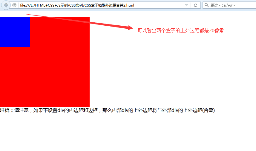 注意两个盒子的上外边距的像素值,很清楚看出都是20像素,尽管看上去有些奇怪,但是外边距甚至可以与自身发生合并。