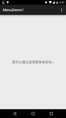 上述的代码非常简单,给大家演示了Android 5.0的中OptionMenu(选项菜单)中动态添加菜单, 以及事件处理,根据id判断用户点击的是哪一项,然后执行对应的操作! 另外,有一点要注意的是,选项菜单经过了三个阶段的过渡: 在Android 2.3.x或者更低版本,因为该阶段大部分的机型都是带有Menu键的, 此阶段通过点击Menu键弹出菜单: