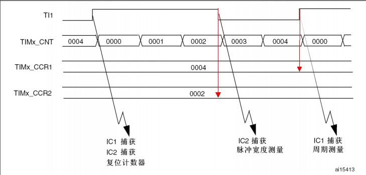 TI1为输入PWM波信号波形,TIMx_CNT为计数器计数值,当第一个下降沿信号到来,IC2会先进行捕获,然后到下一个上升沿到来,IC1进行捕获!在捕获的同时,IC1和IC2会吧CNT的值映射到对应的CCR1、CCR2的寄存器里面,这个值就是我们需要的计数值!