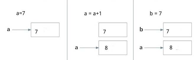 其实,上面操作中的a+1完成的是a引用的对象7+1,只不过是顺着对象7的命名a导入了对象7罢了,这样就在内存中建立了一个新的对象8,同样通过id()函数查看到内存中的地址,通过地址可以看到,这时候的a又自动引用对象8了.