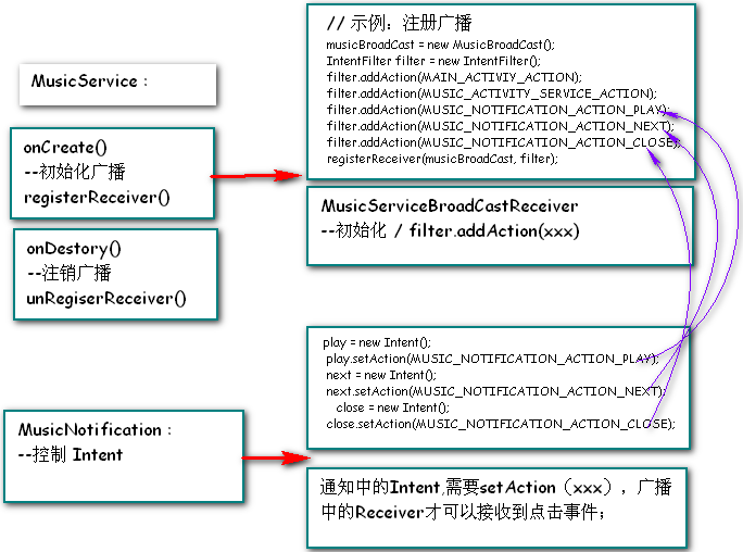 6)广播:如果MusicService想要接收到通知来的点击事件,那么需要在MusicServiceBroadcast中 注册(IntentFiliter/addAction(xxx)),同时通知中的Inent需 要setAction(xxx), xxx 要一样;
