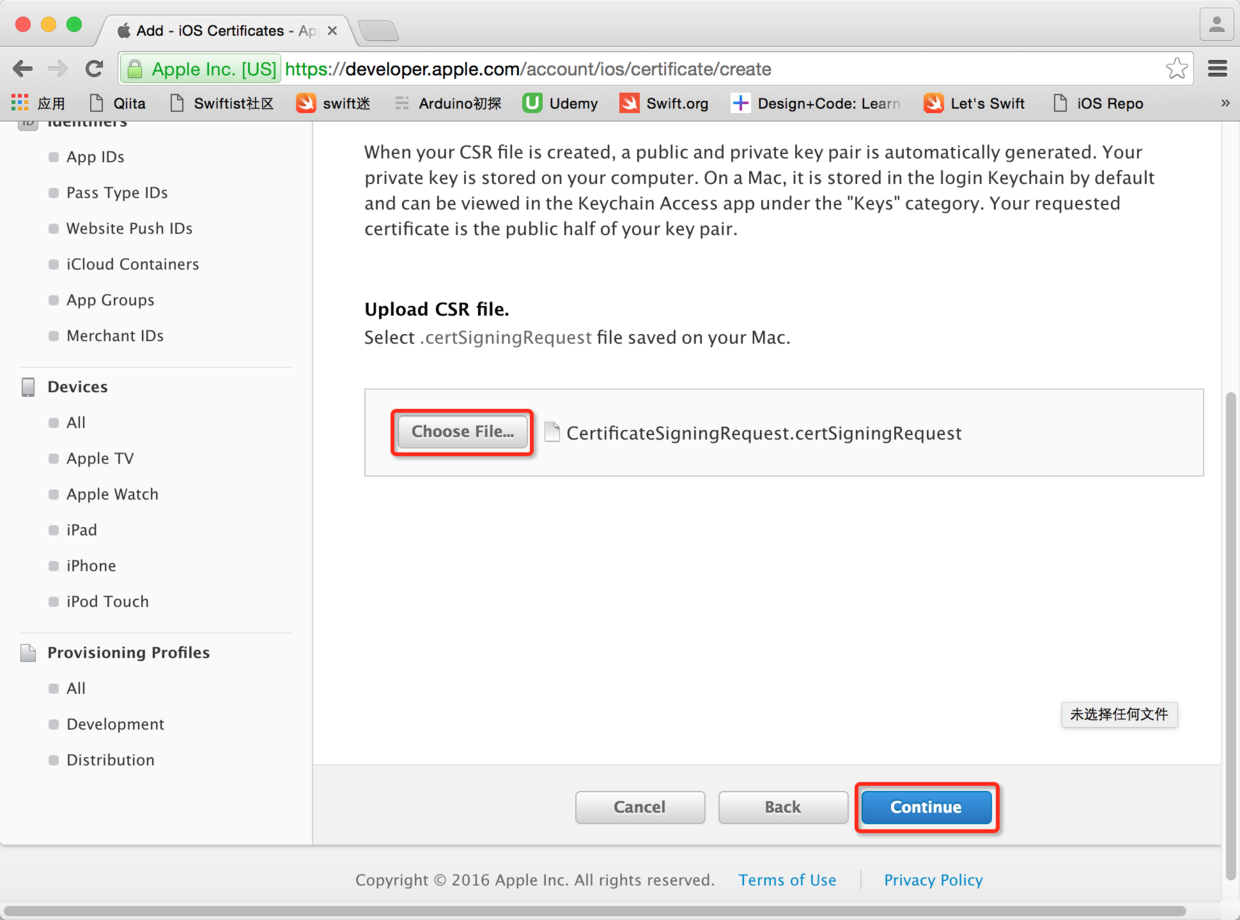 接下来的页面会提示你创建证书需要一个证书签名请求文件,因此我们需要在自己的Mac系统上使用“钥匙串访问”应用创建一个证书签名请求文件