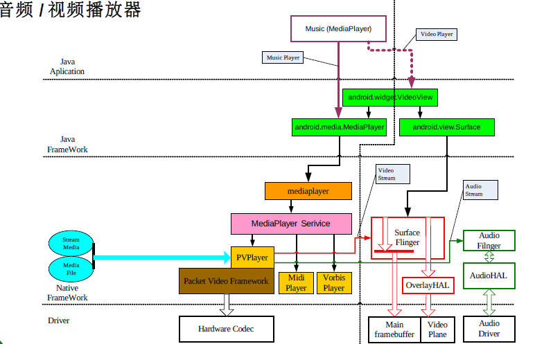 MediaPlayer在底层是基于OpenCore(PacketVideo)的库实现的,为了构建一个MediaPlayer程序,上层还包含了进程间通讯等内容,这种进程间通讯的基础是Android基本库中的Binder机制。